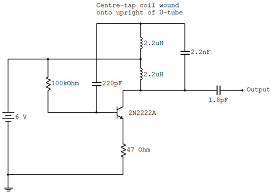 It is simple to construct single transistor oscillators to operate at this low frequency using common components that are easily available in the developing world [47]. An advantage of this analogue approach is that almost any DC power source from 3 V to 12 V could be used, so the unit can be operated from a couple of torch batteries, a car battery or the cell phone USB port (if it has one). The circuit diagram for a suitable Hartley oscillator [48] is shown in Figure 7.