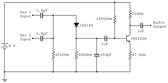 The combined outputs from the two RF oscillators are mixed and filtered to produce the beat frequency before being amplified using a single transistor to generate an output suitable to drive an audio amplifier or the phone, as shown in Figure 8.