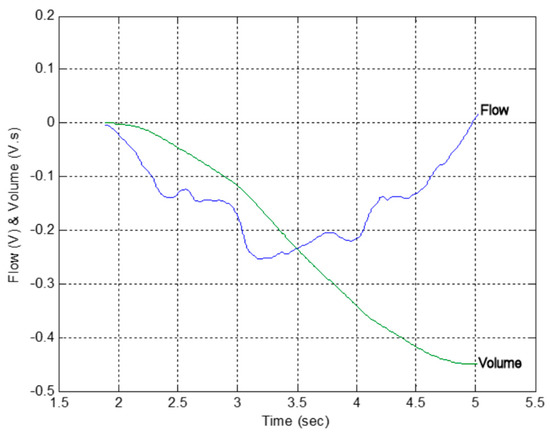 Finally, the earmarked portion of the signal is calibrated and integrated as a function of time to produce an estimate of the forced expiratory volume, as shown in Figure 20, and a measure of flow rate as a function of volume, as shown in Figure 21. These outputs are then used by the nurse or doctor to perform a diagnosis regarding whether the patient is suffering from COPD, or any other respiratory problem such as asthma.