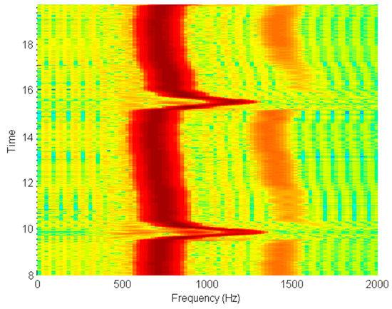 To demonstrate the proof of principle, the smartphone (or laptop in this case) software application initially processes the stored audio signal through a filter with a pass band between 500 and 1500 Hz, to remove low frequency noise and harmonics. The signal spectrum is then obtained using the MATLAB function to generate a spectrogram, a portion of which is shown in Figure 18.