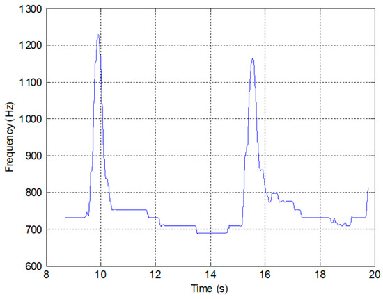 A row by row search finds and generates a vector of all of the peaks within the spectrogram. These are filtered using a 3rd order Butterworth filter with a cutoff frequency of 15 Hz to produce an estimate of the signal frequency as a function of time, as shown in Figure 19. It can be seen that the base frequency is about 730 Hz and increases to about 1.2 kHz during forced exhalation. On inhalation it reduces to just below 700 Hz.