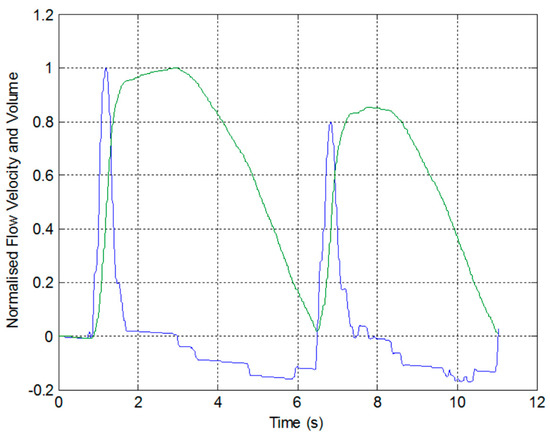 Normalised flow velocity and flow volume obtained from the recorded data produced by the low-cost sensor.