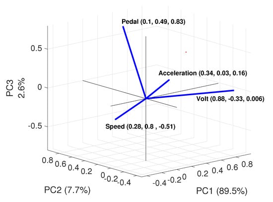 Before being fed to the PCA algorithm, the four input variables (i.e., voltage, pedal, speed and acceleration) are normalized in order to obtain the PCA input data vectors . Each variable is re-scaled as