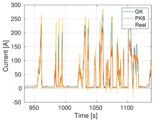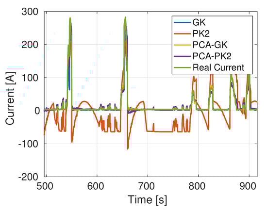 Note that both models, PCA + GK and PCA + PK2, provide adequate virtual current measurements that allow the estimation of the battery SOC from the battery voltage, accelerator pedal position and vehicle speed.