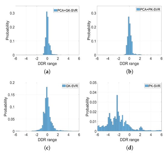 The error distribution can be visually described by drawing the histogram of the DDR for each one of the four different approaches considered. These results (see Figure 4) show that during the training stage, the DDR values for the PCA + GK method vary between −0.9 and 1; those for the PCA + PK2 method between −1 and 2; those for the GK method between −1 and 2; and those for the PK2 model between −5 and 5. Moreover, as it can be seen, the distribution for PCA + GK, and to a lesser degree, for PCA + PK2, has a smaller variance around the optimal zero value, and is thus more reliable than the other methods that do not rely on a preliminary PCA of input variables.