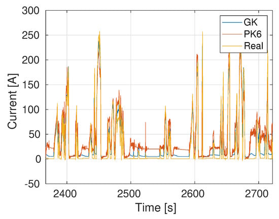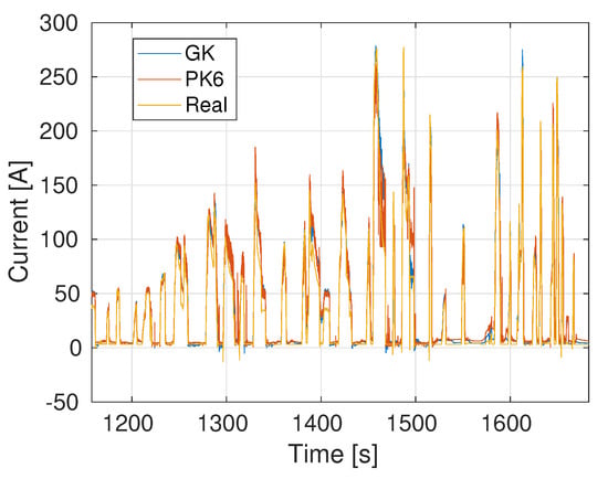 As noted previously, training sets extracted from each one of the four routes considered result in different qualities of virtual sensor. Using, for example, data extracted from Route 1 (900 s) to train the model, the battery current estimations obtained using the data from Routes 2, 3 and 4 are shown, respectively, in Figure 5, Figure 6 and Figure 7. As expected, the Gaussian kernel based model PCA + GK yields the best results, even if the PCA + PK6 model still gives accurate results.