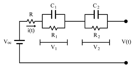 In order to estimate the SOC, the first step is to develop a reliable battery modeling. In this work a model based on the dual polarization (DP) equivalent circuit model is employed to simulate the behavior of the battery cells [10,11]. The DP model is composed of three parts, as shown in Figure 8: