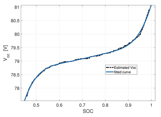 Finally, the relation between and is determined. The relationship between the and the SOC can be described through polynomial data fitting. The fitted curve for the relationship between and SOC is shown in Figure 9, where the from the estimated data is fitted to the SOC value using the order regression polynomial in (20).