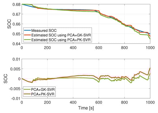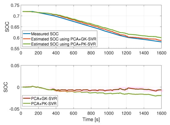 The voltage, the pedal position, the speed and the acceleration were measured and were used as input data to the model. PCA was applied, reducing the dimension of the inputs from to . Then, the data were injected to the SVR model to estimate the current. Finally, the current provided by the virtual sensor was used as input for the DP battery model, to finally determine the SOC.