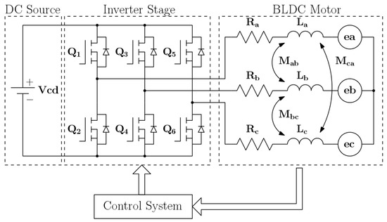 Assuming that the switching MOSFETs and the flyback diodes can be modeled as ideal switching devices [27,28], then, a general network equation for the motor is found to be