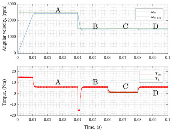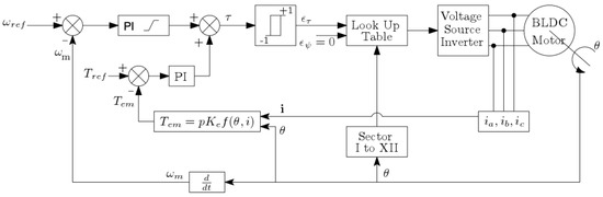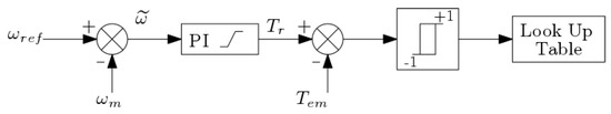 In a typical cascaded control configuration, the output of the PI velocity controller operates as reference for torque of the second loop. In the torque control loop, the torque error, , results from subtracting the electromagnetic torque from the previously computed torque references. This can be seen in Figure 3.