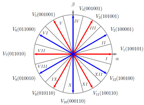Keeping in mind that each phase is electrically excited from a half-bridge arrangement, there are a total of six switching transistors, therefore, six logical states, which define the corresponding switching state of each transistor. Each switching state is associated to a voltage vector in either the or the plane. For the DTC-2+3P, twelve voltage vectors and twelve operation sectors are defined for the plane. Both voltage vectors and sectors for DTC-2+3P are illustrated in Figure 5.
