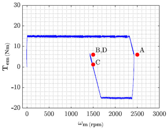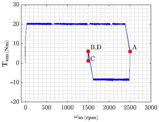 Performance for both speed and torque control was tested for both methods, based on four operational set-points. Point A drives the motor from initial conditions or 0 rpm and 0 N·m, up to a speed of 2500 rpm and a torque of 6 N·m. This first set point is followed by a second or B set-point, where speed is reduced to 1500 rpm and torque is kept constant at 6 N·m. The set-point B is then followed by the C set-point, where speed is now kept constant at 1500 rpm, while torque is reduced to 1.2 N·m. Finally, on set-point D, speed is kept constant while torque is increased back to 6 N·m.