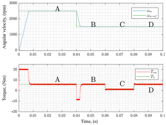 The cascaded PI controller shown in Figure 3 was simulated by applying the sequence illustrated in Table 4. Figure 7 shows the response of the mechanical characteristics, in a torque versus velocity plot, for the whole length of the simulation, highlighting the desired operating points. Figure 8 illustrates the speed and torque curves, respectively, in time domain. Table 5 shows the values of the operating parameters analyzed.