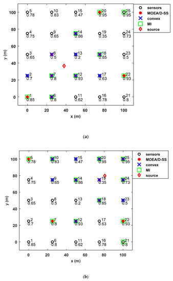 Figure 3 plots the selection results for two different source locations. It can be seen that the sensors selected by convex optimization method are closer to the target location even when they have low reliable probabilities, while the MI-based method always select sensors with large reliable probabilities. This is consistent with the result in [