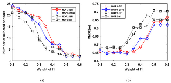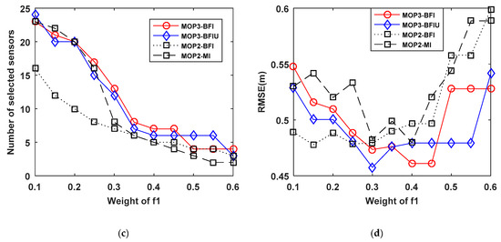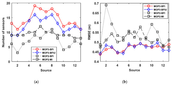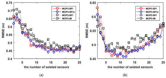 Figure 8 plots the number of selected sensors and corresponding RMSE. We can observe that MOP3-BFI selects more sensors than MOP3-BFIU but having similar localization performance. For MOP2-BFI and MOP2-MI, it is hard to say which is one better to use as performance metrics to select sensors.
