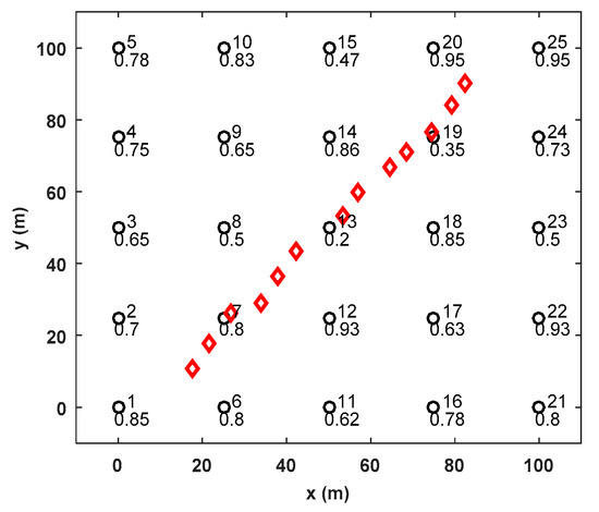 In this section, we will use simulation results to illustrate the effectiveness of the proposed sensor selection method. N sensors are deployed in the interested area to estimate source location. Consider that 25 sensors with known reliable probability are uniformly deployed in the 100 × 100 m
