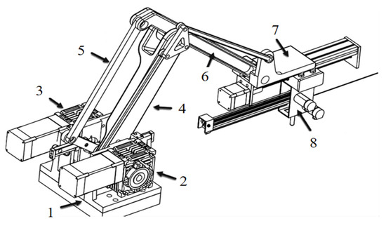 Structure of the cantilevered prostate seed implantation robot. 1. Base; 2. Joint 1; 3. Joint 2; 4. Big arm; 5. Parallelogram mechanism; 6. Forearm; 7. The implant needle is mounted onto a platform; 8. Seed implantation mechanism.