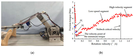 In order to identify the friction parameters of the rotating joint friction model, it is necessary to establish a mapping between the friction torque and the joint velocity of the rotating joint at low velocity. Combined with the variable torque compensation device of the robot arm, the gravity of the big arm and forearm of the robot can be compensated in real time, and the impact of load on the friction torque at the robot joints can be ignored [28]; = 0.