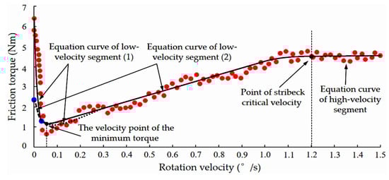 Therefore, according to the experimental results, this paper proposes a segmented parameter identification method. The fitting equation is divided into three parts with minimum velocity point of torque and critical Stribeck velocity point as boundary points. In order to ensure continuity of the equation as a whole, in the low velocity segment section, two methods are adopted, acceleration and deceleration. The cubic spline interpolation curve is used to fit them, and the two equations are tangent to each other at the velocity point of the minimum torque; the values of the two equations are equal here. The piecewise equation for low to high velocity is fitted with the cubic spline interpolation curve based on the end parameters of the upper segment as the starting parameters. The fitting results are shown in Figure 4.