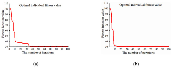 In order to verify the effectiveness of GA-PSO identification, the low-speed segment (1) in the MT Equation (12) was chosen for identification. PSO and GA-PSO were used for comparative analysis. Figure 5a,b are fitness curves of PSO and GA, respectively.