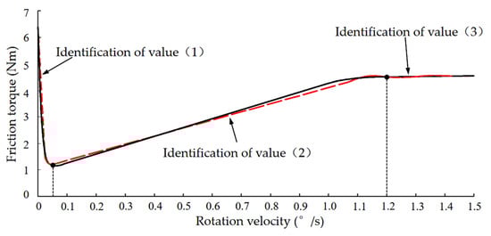 As can be seen from Figure 3b, the critical Stribeck velocity of the cantilevered prostate seed implantation into the big arm of the robot was about 1.2°/s, and when the joint velocity exceeded the critical Stribeck velocity, the friction effect became stable. Therefore, according to Equations (10) and (11), static parameter identification of the LuGre friction model can be divided into a low velocity segment and a high velocity segment, in which the former has the lowest torque when velocity is about 0.05°/s. Most researchers mainly identify a group of results from the low and high velocity segments as a whole [36,37,38,39,40]. However, the friction torque shows a nonlinear trend in moving from low to high velocity segments; thus, tracking precision of the friction torque is difficult to guarantee.