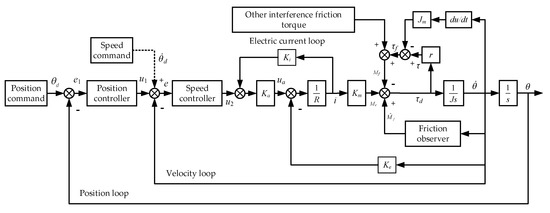 where τf is the nonlinear friction torque of the robot joint; is the action of inertial moment; is the action of coupling moment and centrifugal moment. is gravity torque; τ is the control input torque, τ = rτd, τd is the motor output torque, r is the reduction ratio of the reducer.