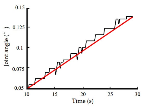 Figure 14a shows the actual angular position curve of the system with a velocity of 0.005°/s under compensation control of the LuGre friction model based on GA identification parameters; the parameters of the LuGre friction model were identified by the whole method. It can be seen that the crawling condition is significantly improved, when compared to proportion control. Although the fluctuation of the curve is reduced and the operation is more stable than before, there is some error, indicating that there still exists a large “dead zone” phenomenon. Figure 14b shows the actual angular position curve of the system under the compensation control of the LuGre friction model with a velocity of 0.005°/s based on the identification parameters of GA-PSO; the parameters of the LuGre friction model were identified by the subsection method. The control effect of this method was found to be good, the creep phenomenon was suppressed, and the “dead zone” phenomenon had significantly improved.