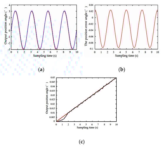 At the same time, for step signal with input velocity of 0.005°/s of the simulation model and when the position control is turned off, as shown in Figure 9c, velocity PID control is not ideal. A creeping phenomenon is visible and at the output of the simulation angle position there exists a 2s “dead zone” occurrence. However, when compared with the open-loop control in Figure 8, the effect is found to be a bit better.