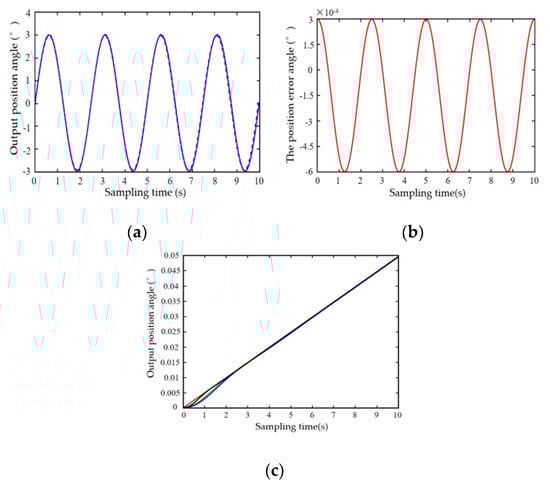 In the step response velocity simulation process, in this paper, PSO, GA, and GA-PSO are used for comparative analysis. The PSO and GA identification LuGre model adopts the whole identification method. Similarly, the step response signal with a velocity of 0.005°/s was input into the simulation model and the position control is turned off. The results are shown in Figure 10c, where the red line represents the theoretical angular position curve with a velocity of 0.005°/s; the blue, green, and black lines represent the simulation angular position curve of the LuGre friction model compensation control identified by PSO, GA, and GA-PSO, respectively.