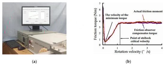 Figure 11b provides a comparison between the actual output friction torque of the revolute joint of the robotic big arm and the friction observer identification friction torque based on the LuGre model that offers piecewise parameter identification by GA-PSO within rotation velocity of (0–4°/s). Here, rotation velocity greater than 1.2°/s is considered high, and the friction torque is nearly stable. It can be seen from the figure that the friction observer identification torque based on the LuGre model can clearly identify the actual friction torque and offset the friction torque to ensure smooth operation of the moving joint at low velocity.