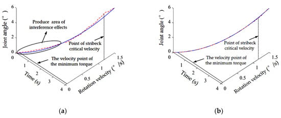 The robot moves due to static friction force on the rotating joint, DC motor, and reducer. During motion, the static friction force is always greater than the dynamic friction force, creating a large imbalance angle. When the rotating joint of the robot moves, the static friction force becomes the dynamic friction force, and the friction force gradually decreases. However, due to the inertia of the system itself, the robotic joint increases its rotation, making the misalignment angle smaller and decreasing the motor torque. As a result, the rotating joint begins to decelerate. When the rotating velocity advances towards 0, the friction force of the rotating joint, the DC motor, and the reducer is transformed into static friction force. The friction torque instantly increases, forcing the mechanical arm to stop rotating. However, as the instructions to move continue, the imbalance angle continues to increase. In order to overcome the static friction force, the output torque of the motor increases again, and the rotating joint re-enters a rotational state. Because this is constantly repeated, it results in what is called the “shake with crawl” phenomenon.