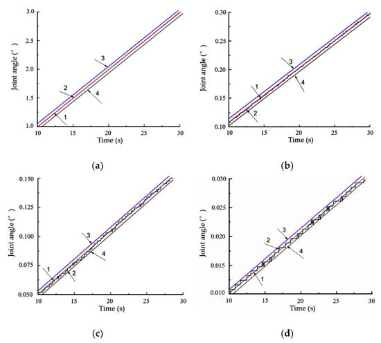 Angular position curves with different velocity without friction compensation control. (a) angular position curve with a velocity of 0.1°/s; (b) angular position curve with a velocity of 0.1°/s; (c) angular position curve with a velocity of 0.005°/s; (d) angular position curve with a velocity of 0.001°/s.