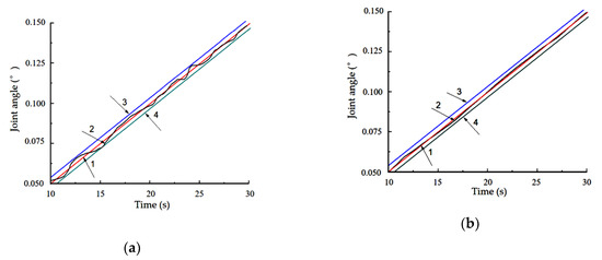 In order to verify the effectiveness of the piecewise parameter identification of the LuGre model, the whole and piecewise methods were used to compare and analyze the compensation control process of the model based on fixed parameters. In the experimental process, the GA-PSO method was used to identify the experimental results obtained in Section 4.2.2 by the whole method and segment method, and the identification results obtained, respectively, were used for variable velocity experiment analysis, as shown in Figure 12. The solid blue line and the dotted red line, respectively, represent the theoretical curve and the actual curve of the joint angular position response when the rotation velocity of the arm joint increases from 0 to 1.5°/s at a time of (0–4) s.