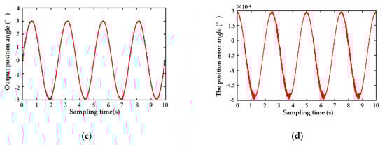 Figure 13a shows the angular position curve with a velocity of 0.1°/s, from which it can be seen that the system response tracking effect is good with almost no error. Figure 13b shows the angular position curve with a velocity of 0.01°/s. At this point, it can be seen that there is a slight creeping phenomenon during system tracking. Figure 13c is the angular position curve with a velocity of 0.005°/s, at which point the creep phenomenon during system tracking is obvious. Figure 13d is the angular position curve with a velocity of 0.001°/s. These figures clearly show that the crawling and jumping phenomena become more and more obvious as system velocity gradually decreases.