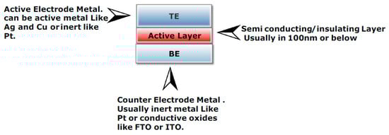 The memristor is a Metal–Insulator–Metal (MIM) structure device, as shown in Figure 1. A thin layer of insulator or semiconductor material (also called active layer or storage layer) is sandwiched between the two metal electrodes. Memristive devices with a layer thickness of few nanometers and low operating voltages with switching energy of few femtojoule (fJ) have been successfully implemented [25,26].