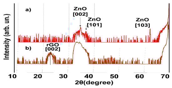 The crystallinity of pure ZnO and ZnO–rGO composite thin film was studied via an X-ray diffraction (XRD) pattern. XRD was performed on both the thin films by using a RIGAKU−Geigerflex diffractometer with a copper (Cu) anode to generate Cu Kα radiation (α = 1.5406 A˚). The diffraction pattern was studied in the 2θ range of 10–80°. Figure 3a,b shows the diffraction patterns for the two prepared thin films, (a) ZnO and (b) for ZnO–rGO film. The observed characteristic peaks for the ZnO sample, as shown in Figure 3a, correspond to (002), (101), and (103) crystal planes at 34.4°, 36.3°, and 62.9° (2θ), respectively, while the diffraction peaks for the crystal plane (002) at 34.4° of a sample ZnO–rGO is shown in Figure 3b. This suggests that the crystalline ZnO in both of the samples has a hexagonal wurtzite crystal structure with a c-axis orientation [24]. The widespread peak at 34.4° (2θ) in Figure 3 is most probably due to the small grain size of the nanoparticles. Moreover, in Figure 3b, another peak is visible at 24.4° (2θ); this characteristic peak corresponds to the (002) crystal plane of rGO. Since, in Figure 3b, there are no other diffraction peaks. Therefore, it is used to convey that the GO has been fully reduced to rGO [36].