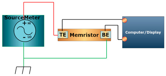 The electrical characterization was done using a Keithley 2612 source meter. The Al TE electrode was connected to the HI connector and the FTO BE electrode was connected to the LO connector of the source meter. The experiment measurement setup is shown in Figure 4.