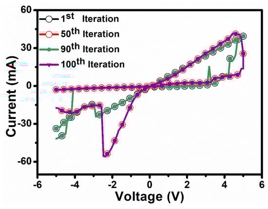 To test the stability of the device, I–V measurements were recorded for 100 consecutive ±5 V voltage cycles. The multiple voltage sweeps’ I–V measurement result is shown in Figure 7; the device shows good stability and very little variation in switching characteristics.