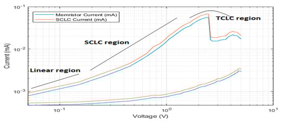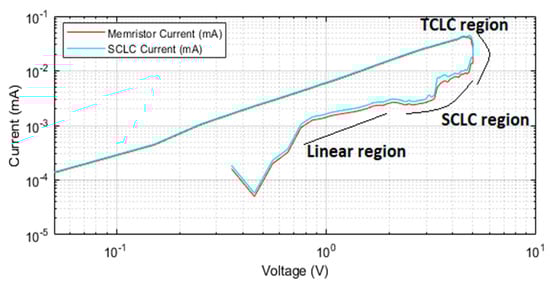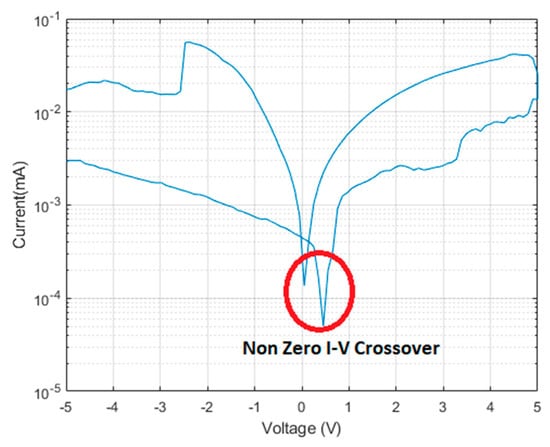 The I–V curve is not a perfect pinched hysteresis curve, which suggests that the device has some energy stored at 0 V. Replotting of the I–V curve in semilog scale shows more clearly a picture for non-zero crossing of the I–V curve (Figure 8). Due to the non-zero crossing hysteresis loop, this device falls into the non-ideal or extended memristor class, as detailed in [20,21,37,38,39].