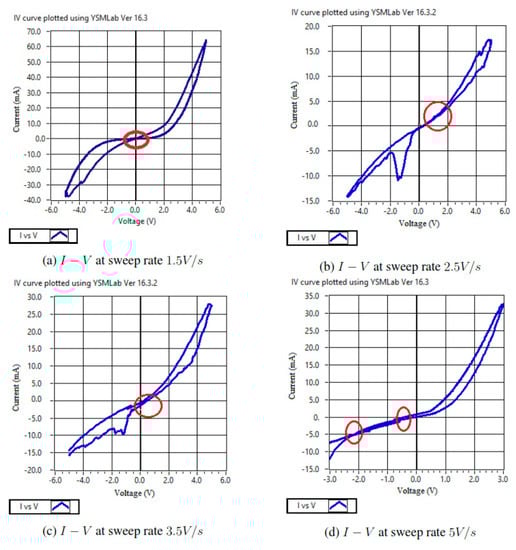The I–V curve for the ZnO–rGO device at different input voltage sweep rates (1.5, 2.5, 3.5, and 5 V/s) are summarized in Figure 9a–d, respectively. The following observations were made based on the results obtained during our experiment.