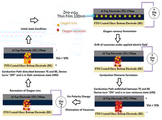 The operating mechanism of the ZnO–rGO thin film memristive device is filamentary (i.e., the formation and breaking of conductive filaments (CFs) between TE and BE). The filamentary-based switching in ZnO devices has been reported previously in different works in the literature [40,41,42,43,44,45,46].