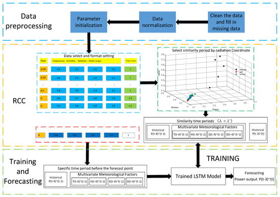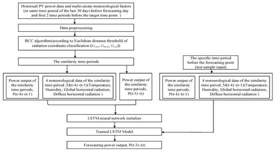 As previously mentioned, obviously, the learning network models have outstanding performance on various forecasting tasks []. Unlike the physical method, the LNs model does not require a complete understanding of the photoelectric conversion relationship inside the PV system in advance. However, the prediction accuracy of the LNs model usually relies on the calculation of higher dimensions to ensure the effect, which increases the calculation and slows down the prediction speed. On the other hand, for a real-time VST forecasting model, reasonable training time is required, and there are two methods that can be applied to solve this contradiction: reducing training sample size and improving the quality of samples. Thus, the influence of different meteorological parameters on PV power output in a short period of time is firstly analyzed. Then, in order to reduce the training time and improve the accuracy of predictions, the dataset of similar time periods is selected according to the relationship between short-term radiation coordinates and power output. Considering the advantage and flexibility of LSTM, this model applies LSTM as the learning network. Furthermore, the proposed RCC-LSTM model does not require very long-term historical data, which allows the system to forecast VST PV power generation after a short-period of self-running, and the sliding window enables the predictive model to be self-updated in real-time and adapt to the natural attenuation of PV systems.
