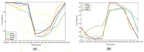 This paper selects three random days for analysis in four quarters (includes January 15, February 22, December 20, summer in Australia, April 30, May 20, June 1, Autumn in Australia, July 7, July 18, August 6, winter in Australia, and September 1, September 22, spring in Australia). Time range from 8:30–17:30, 109-time points in total, four representative and easily available meteorological factors are selected for comparison. The correlations between different features with power output at different time period are calculated by ρd,p, and the average of three days was randomly selected.