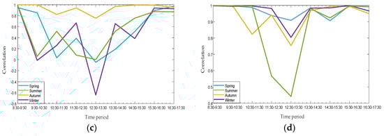 Figure 3a illustrates the correlation between temperature and PV power generation over different hours of the day. It can be seen that there is a certain degree of similarity between the four seasons, but there are still minor differences, and the correlation varies from −0.75 to 1 during a single day, this fluctuation is large. At the same time, in Figure 3b. The fluctuation range of correlation between humility and PV power generation over the different time period is between −1 and 0.75, there are also subtle differences in four seasons. Moreover, the Figure 3c represents the correlation between diffuse horizontal radiation and PV power generation. The correlation is in the range from −0.6 to 1 and there is a kind of regulation within one day, but the degree of correlation in different seasons is quite different. However, as shown in Figure 3d. The correlation between global horizontal radiation and PV power output always keeps a high value, most are distributed between 0.8 and 1.0, a few are between 0.4 and 0.7. Thus, it is more reasonable to use global horizontal radiation to collect similar time periods.