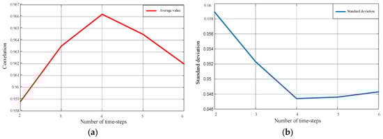 As shown in Table 2. The correlation between the d of different scale radiation coordinates and the PV power output p at the next moment is obtained. In Figure 4, it can be observed that they have high correlation value, more than that, the ρd,p mean value and standard deviation of different time-steps are shown in Figure 4a,b, and when the time point is 4, the correlation is higher and the stability is better. Thus, the 4-time points before the prediction point are selected as the analysis time period.