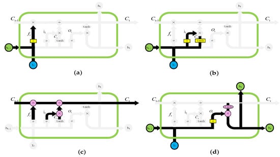(a) Forget gate; (b) Input gate; (c) Merge process; (d) Output gate.