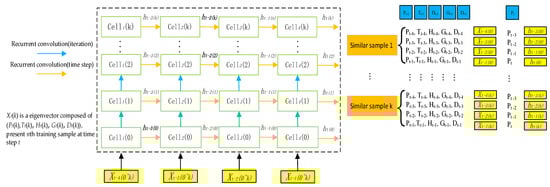 where, ht is Pt+1, represents the power output at the next moment, Xt is an eigenvector composed of (Tt, Ht, Gt, Dt, Pt), and Tt, Ht, Gt, Dt present four multivariate meteorological factors at time point t, while Pt presents power output at time point t. The training process of LSTM is shown in Figure 7.