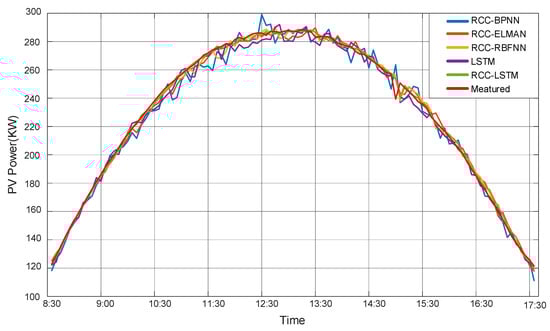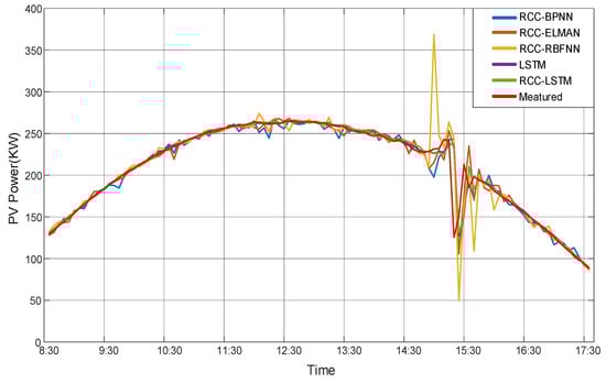 To verify the validity of the proposed RCC-LSTM model, several typical networks, including RCC-BPNN, RCC-RBFNN [], RCC-Elman, and LSTM-RNN [] are chosen to make comparison, and the test are conducted in four seasons and two different PV systems. In addition, four different evaluation metrics (RMSE, MAPE, MAE, and R2) are applied to verify the prediction accuracy of the RCC-LSTM model. Figure 9 and Figure 10 represent the forecasting result curves obtained by running different prediction models on two random days, respectively.