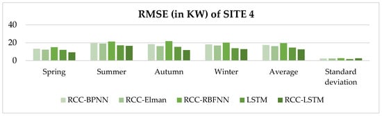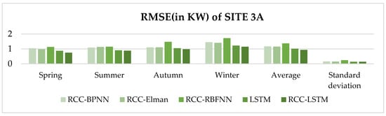 The metrics results of the RMSE in SITE 3A and SITE 4 are shown in Figure 11 and Figure 12, respectively. The RCC-LSTM model has the best prediction accuracy: the mean value of RMSE is 0.94 KW (in SITE 3A), which is the minimum for all models, compare with other models, the enhancement is 24.79%, 23.25%, 45.83, and 8.23%, respectively. In SITE 4, the RMSE has 12.58 KW mean value, and the enhancement is 38.38%, 28.18%, 55.33%, and 16.08%, respectively. However, due to the limit of data set, in RMSE, the standard deviation performance of LSTM is slightly lower than RCC-LSTM.